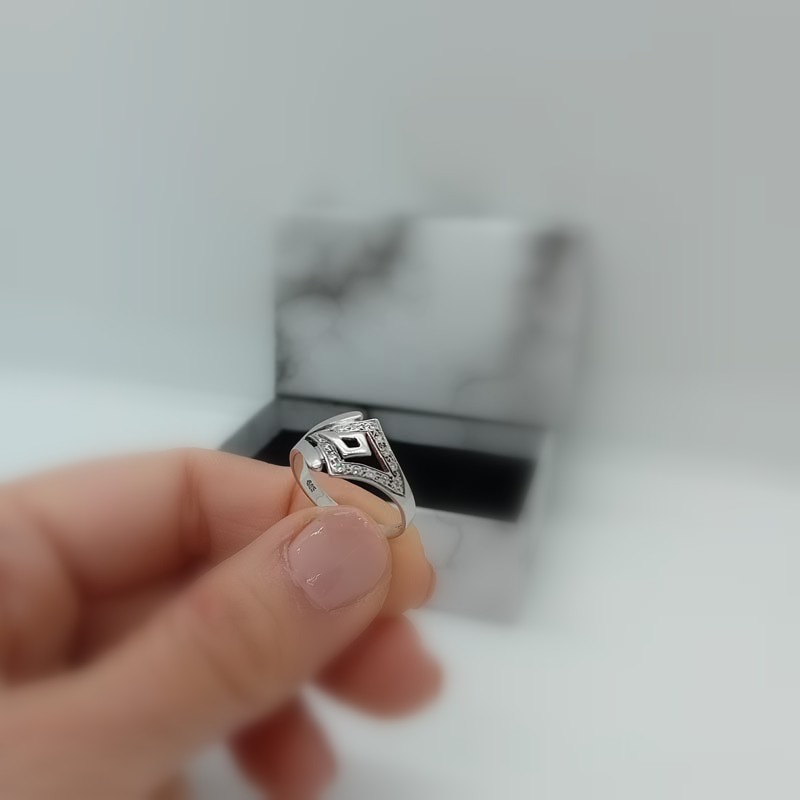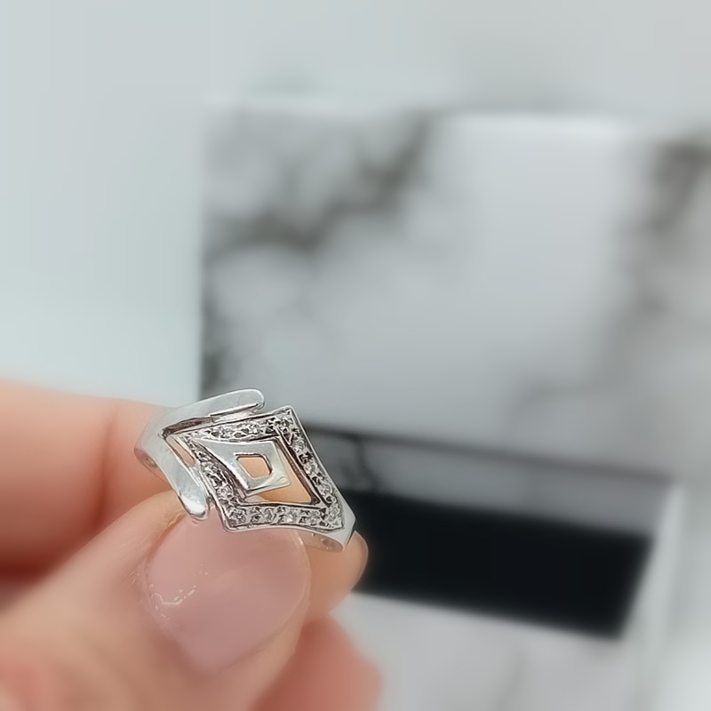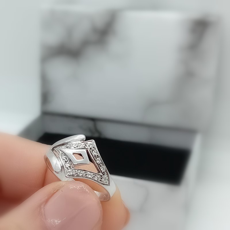 Τόσο σικ design σε πολύτιμο δαχτυλίδι από λευκόχρυσο 14 καράτια, με λουστρέ όψη και λευκά ζιργκόν που σχηματίζουν ρόμβο! Διαχρονικό κόσμημα για αγαπημένο πρόσωπο!