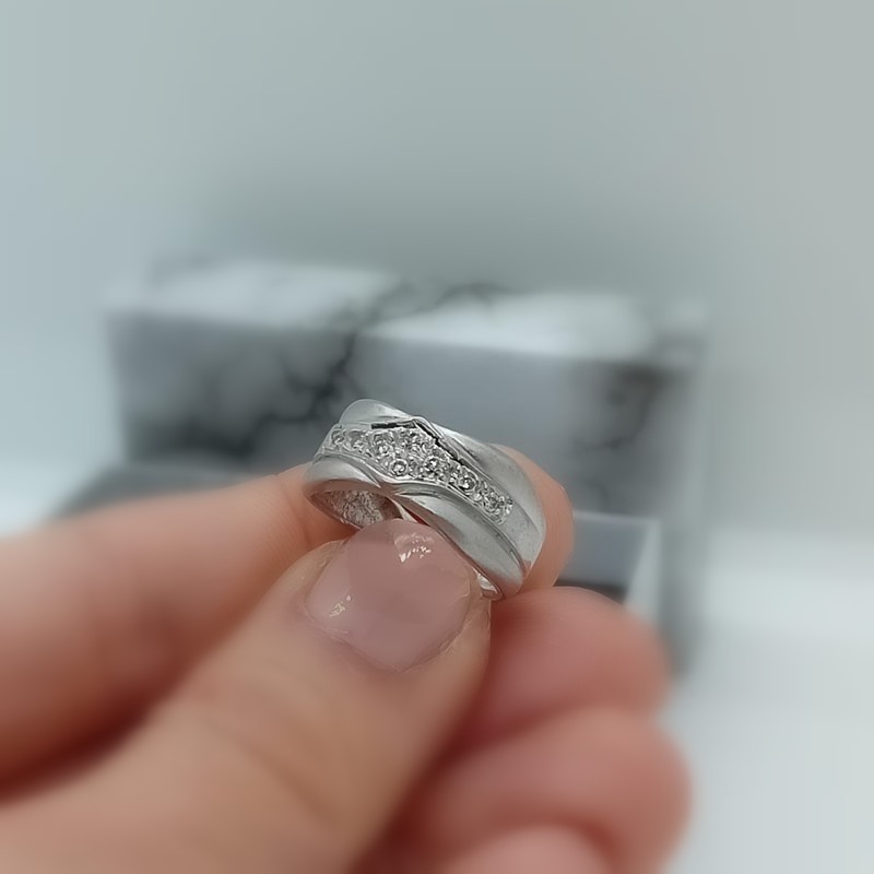 Ένα δαχτυλίδι πραγματικά άξιο για πριγκίπισσα! Από λευκόχρυσο 14 καρατίων, με μια οριζόντια λουστρέ γραμμή να διατρέχει την ματ μφαρδιά προστινή όψη του και με εκτυφλωτικά λευκά ζιργκόν .Ένα κόσμημα απαράμιλλης ομορφιάς και διαχρονικής ποιότητας.