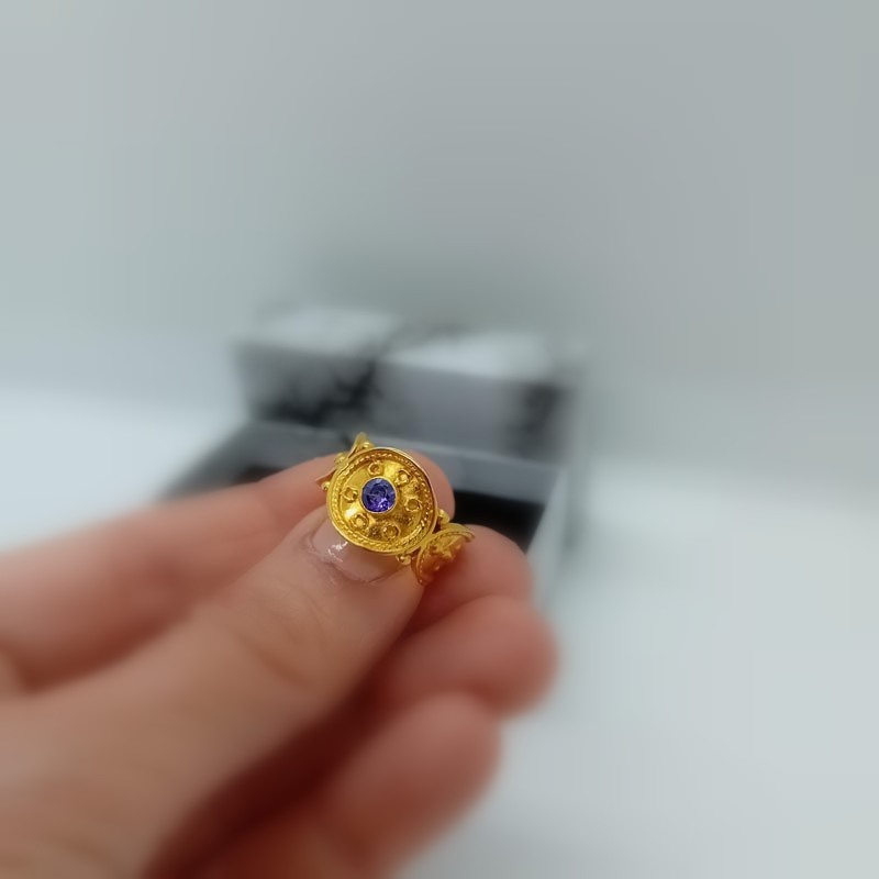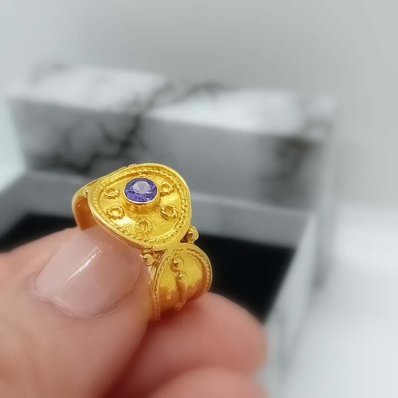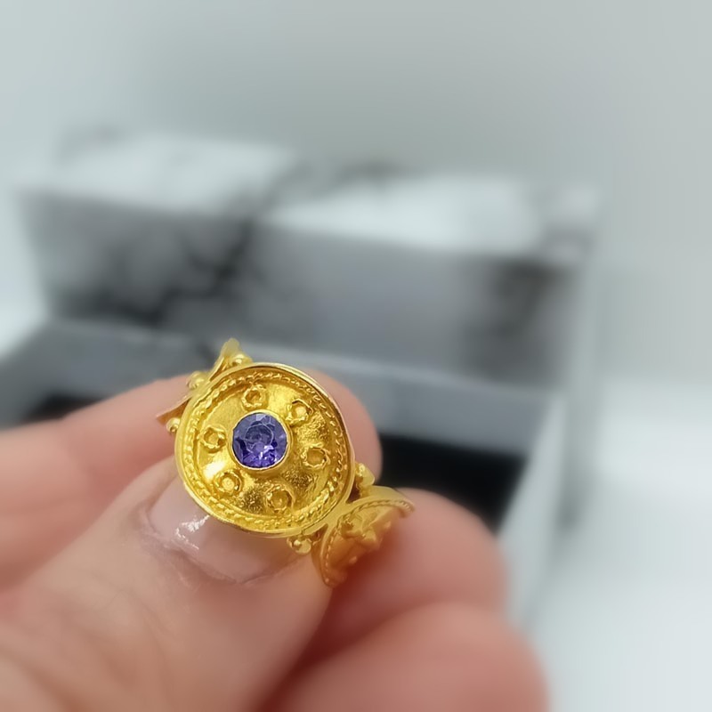 Σε προκαλεί να το αποκτήσεις! Πολύτιμο δαχτυλίδι από χρυσό 14 καρατίων, εμπνευσμένο από την αίγλη μιας Βυζαντινής αρχόντισσας , με περίτεχνο λεπτομερές σκάλισμα και έναν στρογγυλό δίσκο στο κέντρο με ένα πελώριο αμέθυστο σε μωβ απόχρωση. Ιδανικό δώρο αρραβώνα, γάμου, επετείου.