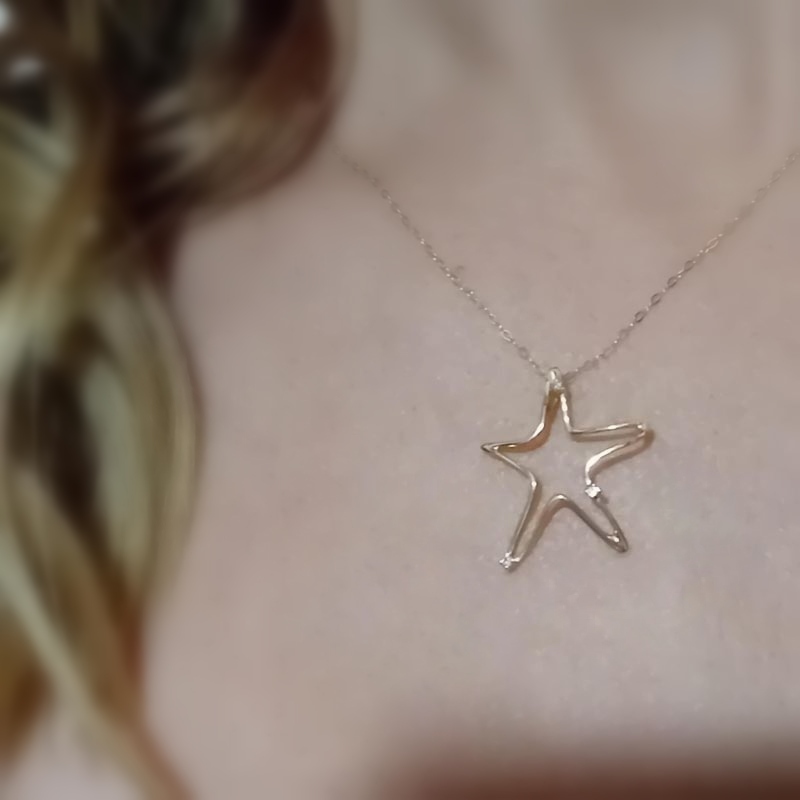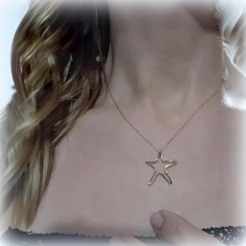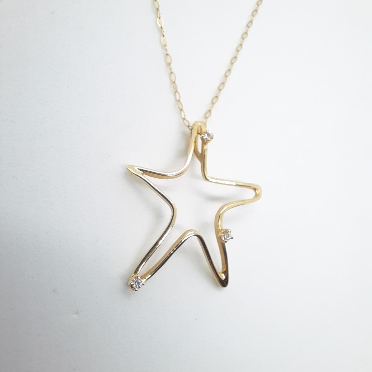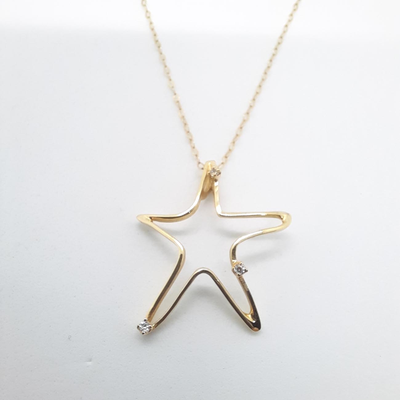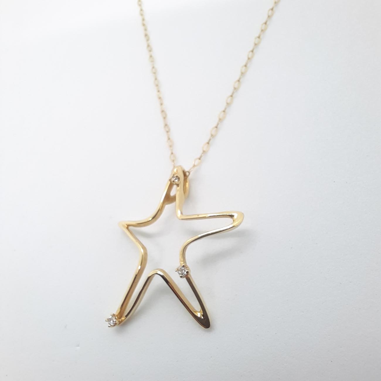 Είσαι το αστέρι που φωτίζει τον ουρανό μου! Αυτό εκφράζει το εντυπωσιακό αυτό κολιέ , μεγάλο αστέρι, από χρυσό 14 καρατίων, σε μοντέρνο design λεπτής γραμμής, 3 λευκά διακριτικά ζιργκόν και με φινετσάτη αλυσίδα .