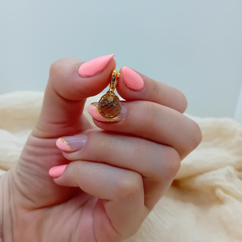 Απίστευτης ομορφιάς κρυστάλλινη μπάλα σε απόχρωση απαλό κίτρινο, με χρυσό μεγάλο κρίκο 14 καρατίων και δύο λευκά ζιργκόν για μια εκτυφλωτική εμφάνιση.