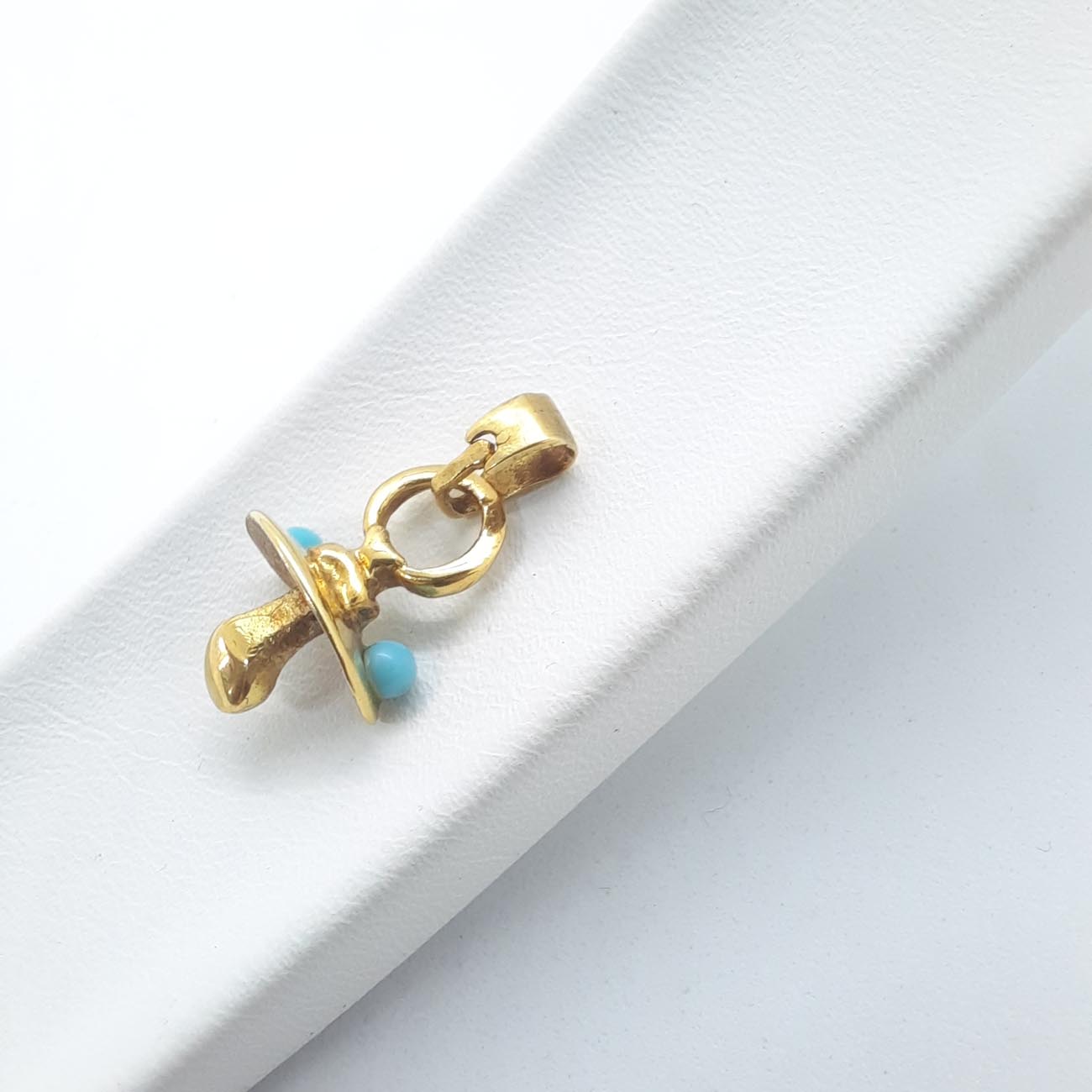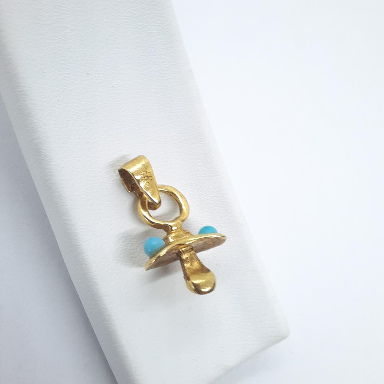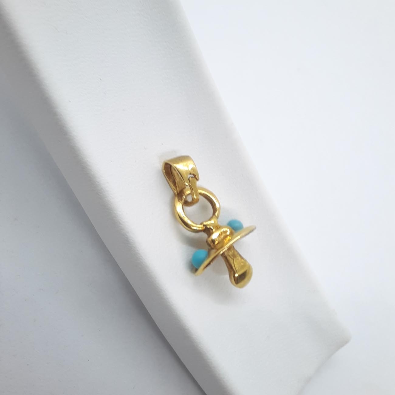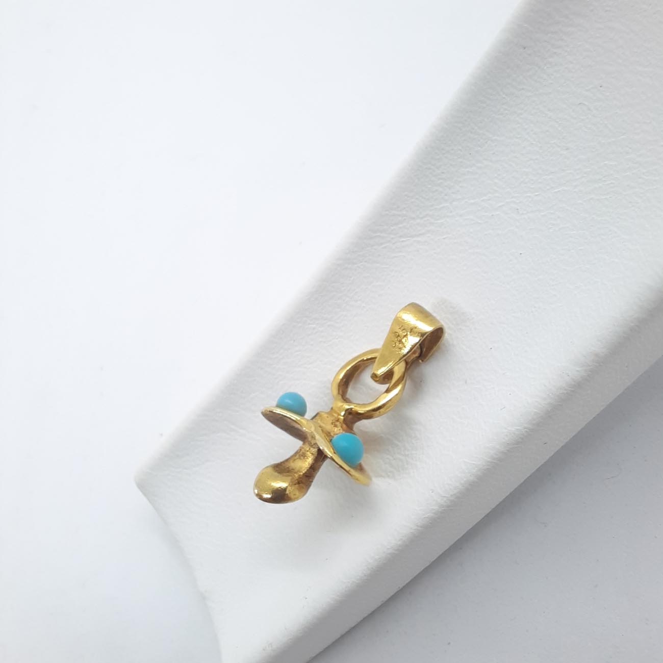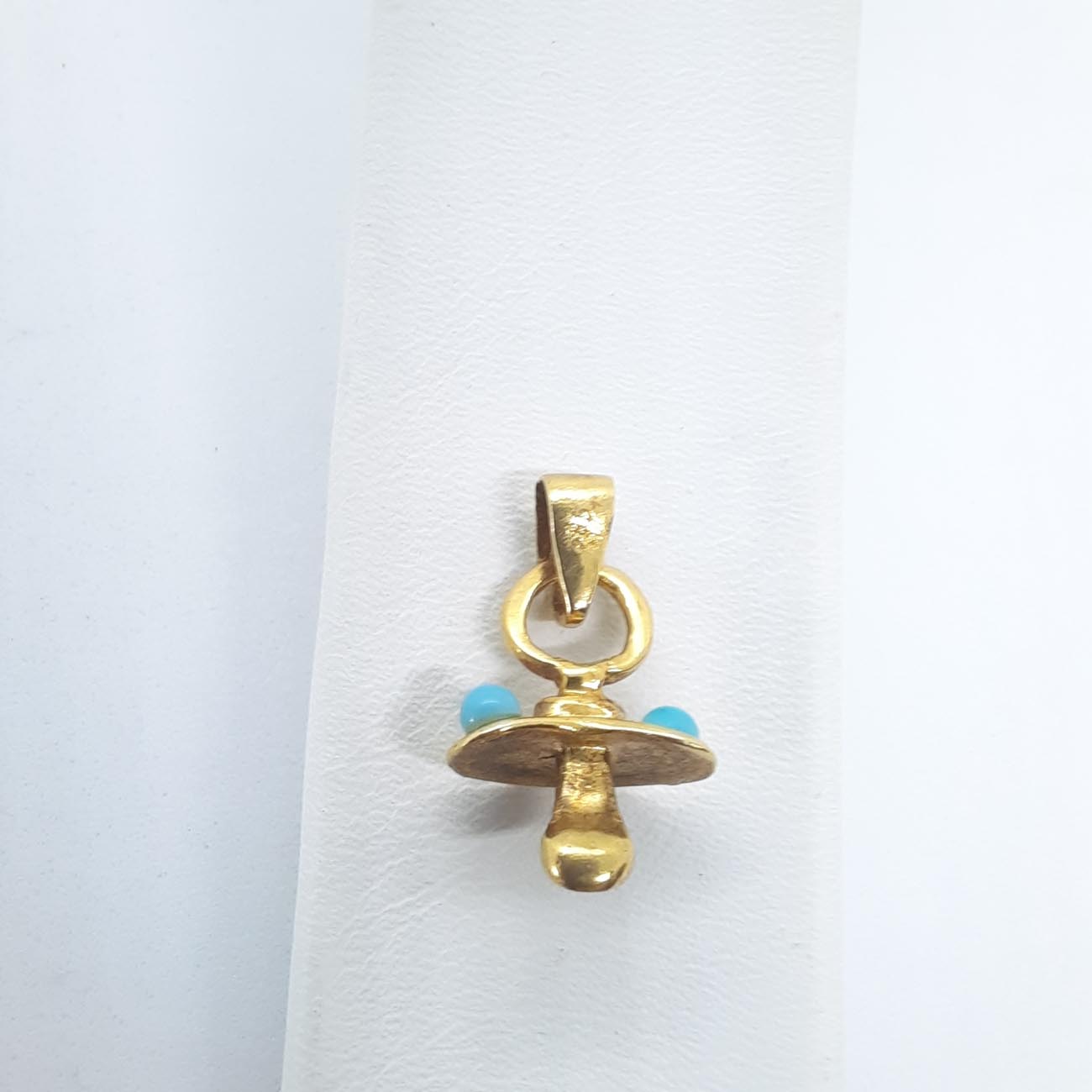 Το ιδανικό δώρο για την νέα μανούλα! Μια πιπίλα νεογέννητου από χρυσό 14 καρατίων με ημιπολύτιμο λίθο τυρκουάζ, μενταγιόν που θα αποτελέσει μοναδικό ενθύμιο χαράς και συγκίνησης.