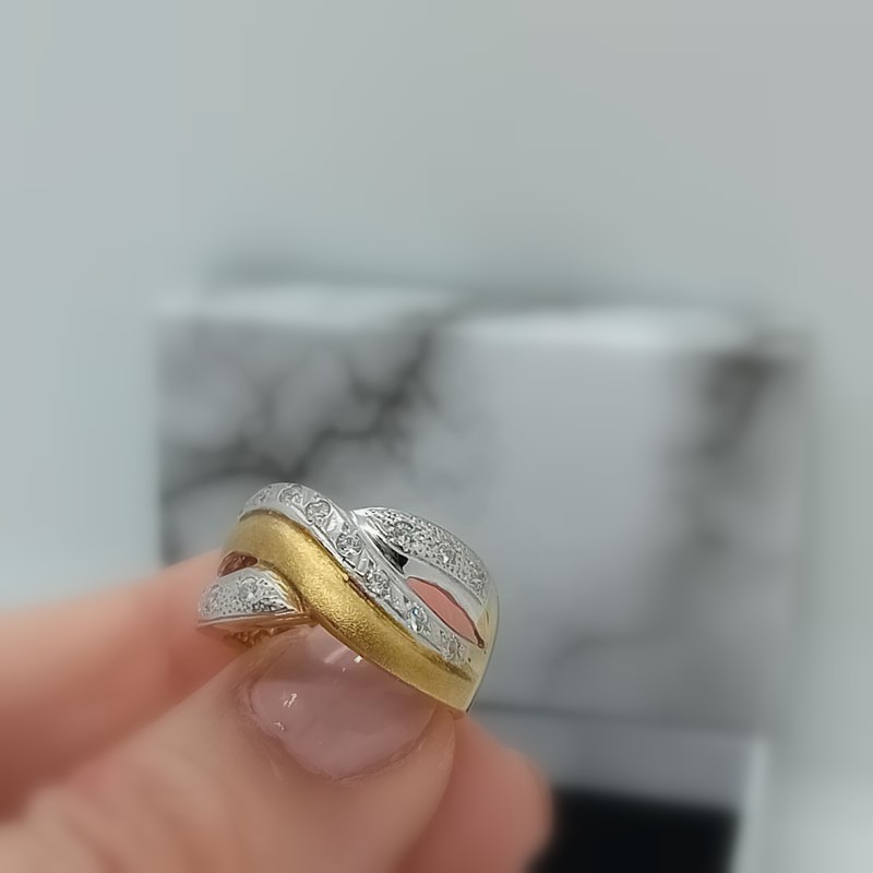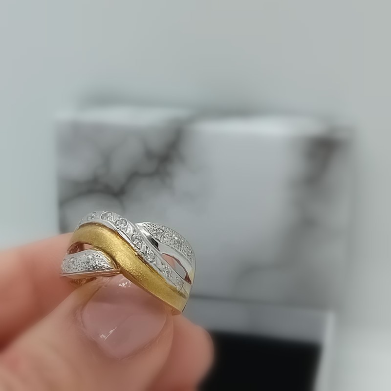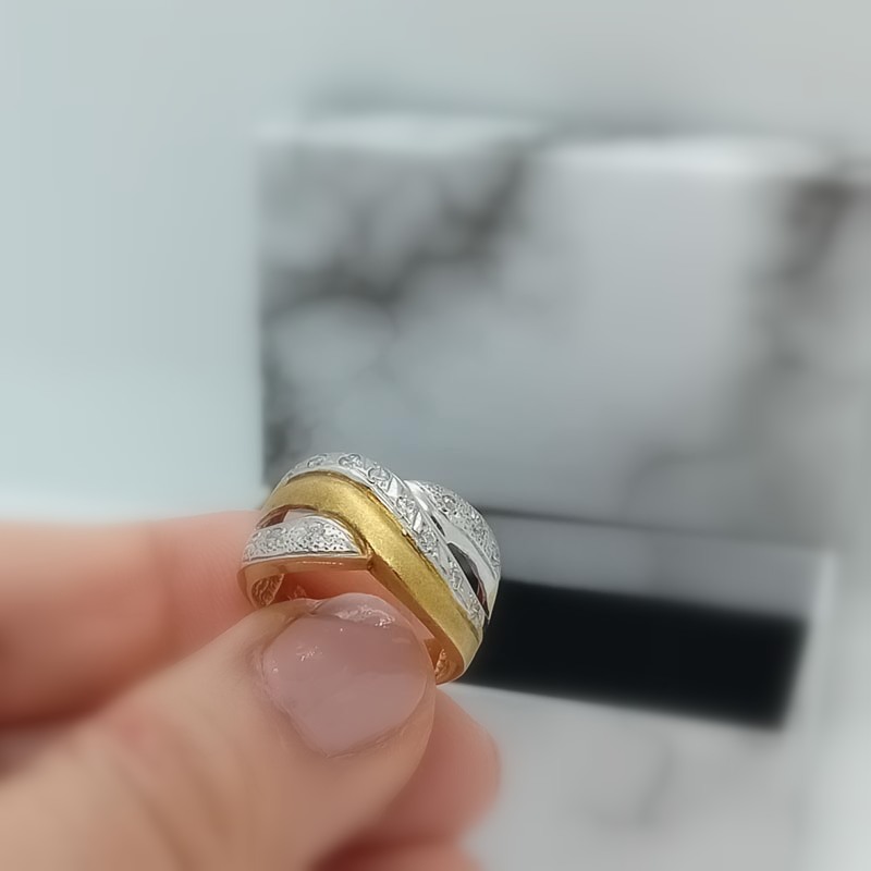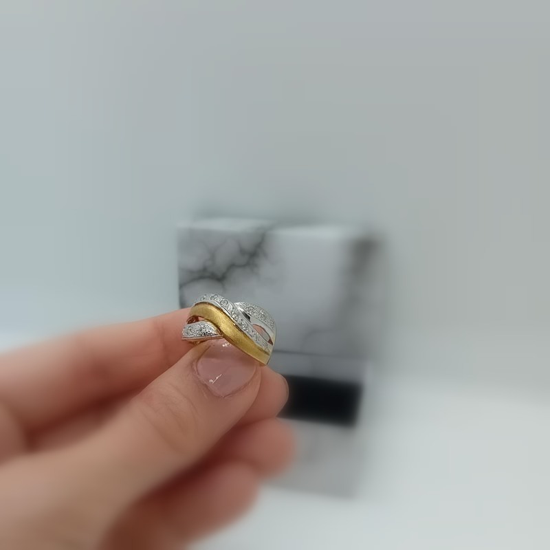 Ολόκληρο το δαχτυλίδι σχηματίζει το σχήμα του άπειρου, από χρυσό 14 καράτια , ματ μπροστινή όψη και λουστρέ φαρδιά γάμπα, με λευκά αστραφτερά ζιργκόν, ιδανικό βαρύτιμο κόσμημα για αρραβώνα, γάμο , επέτειο , γενέθλια!